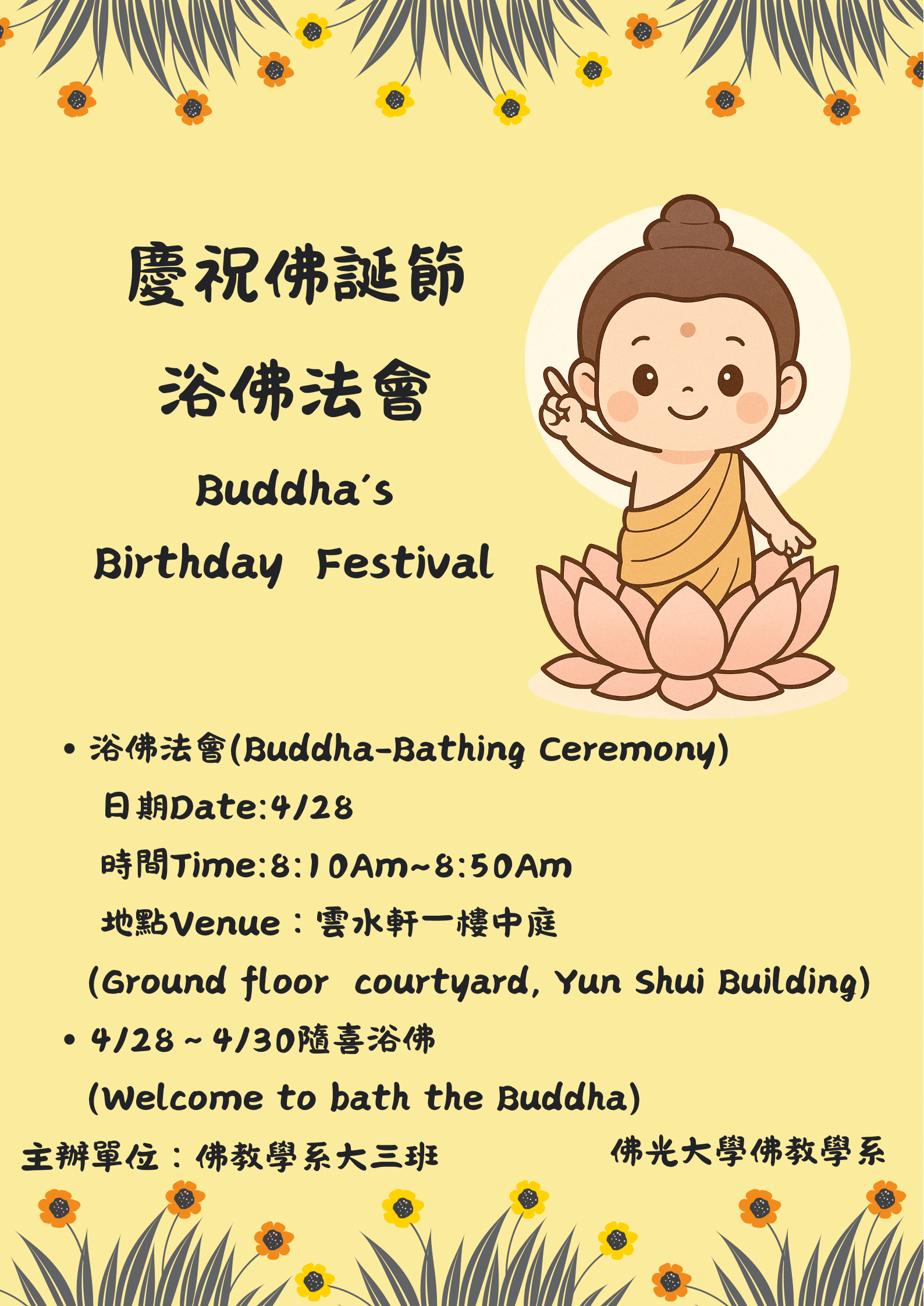 欢喜浴佛・庆祝佛诞 2025-04-25 buddhist网站管理员 佛教学系大三班诚挚邀请大家一起来浴佛! 一瓢清水净心也净行,灌溉我们的慈悲与宁静~ 不论你是第一次参加,还是每年都不缺席, 都欢迎一起来共沐佛恩、洗涤身心、种下好因缘 时间|4/28(一)08:10–08:50 地点|云水轩一楼中庭 4/28–4/30自由浴佛开放中,随时来、随喜参与! 来浴佛、拍照打卡、欢喜迎佛诞